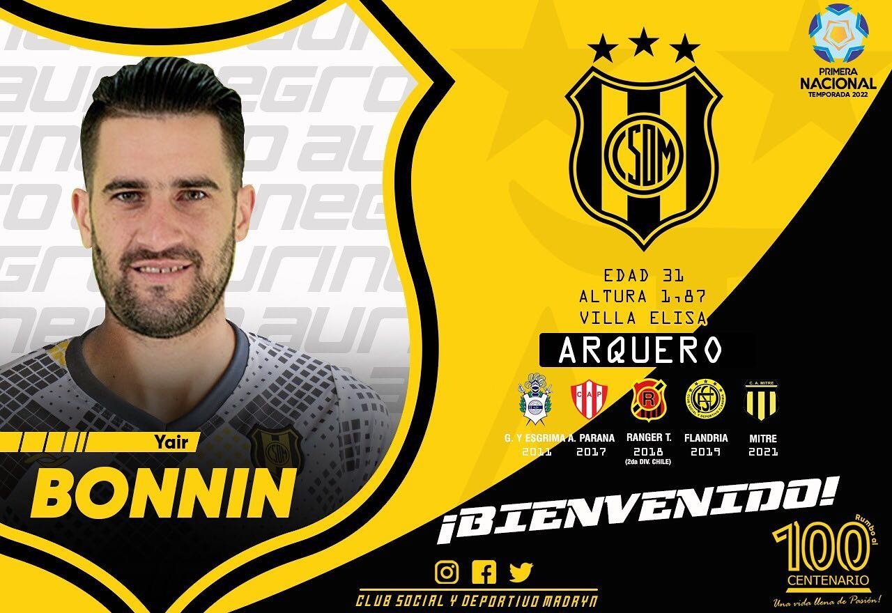 Deportivo Madryn sumó un nuevo refuerzo, el arquero Yair Bonnin, para encarar el próximo torneo de la Primera Nacional, a la que ascendió al superar en la final del Federal A a Racing de Córdoba.