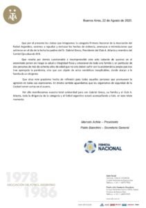 Por su parte, la mesa de la Primera Nacional emitió un comunicado exponiendo la solidaridad para con Gabriel Greco, su familia y el Club A. Atlanta.
