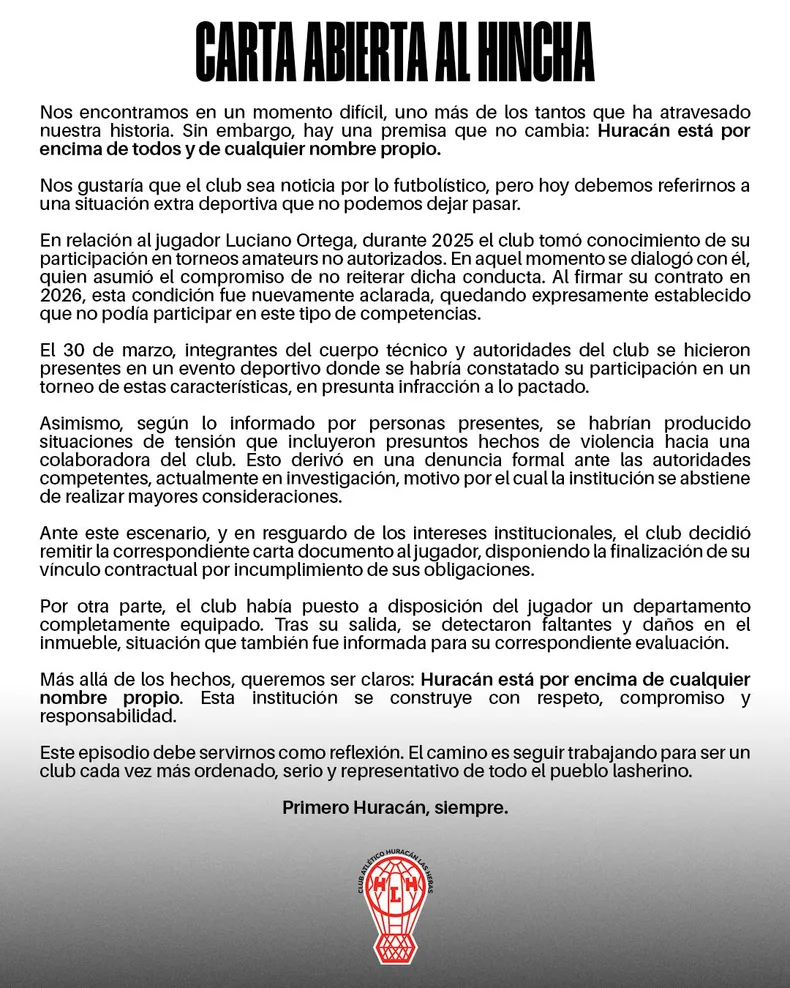 En el cierre, el club apeló a una reflexión interna: “Este episodio debe servirnos como reflexión. El camino es seguir trabajando para ser un club cada vez más ordenado, serio y representativo”. La carta concluye con una frase que sintetiza el posicionamiento institucional: “Primero Huracán, siempre”.