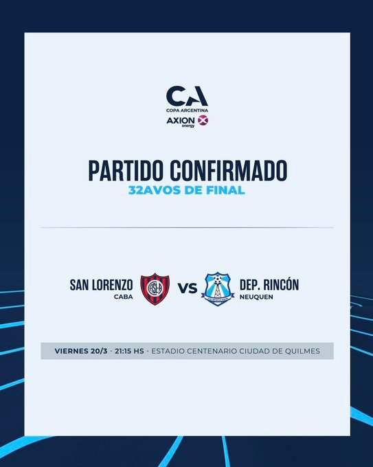 Se confirmó la sede y el horario para el cruce entre Deportivo Rincón y San Lorenzo por los 32avos de final del certamen.