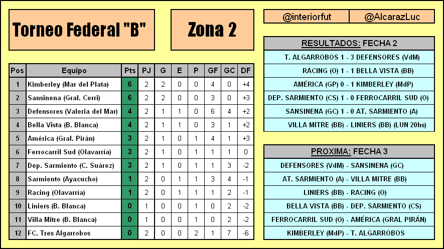 Tres Algarrobos tendrá un difícil partido la fecha siguiente ya que enfrenta a Kimberley de Mar del Plata, como visitante, equipo que hasta ahora ganó todo y es el puntero de la zona por diferencia de gol, mientras que el victorioso Defensores de Valeria recibirá en la fecha 3 a Sansinena de General Cerri, el reciente ascendido que ganó los dos que jugó y es otro de los punteros.