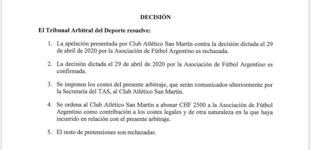 El Tribunal Arbitral del Deporte falló a favor de la Asociación del Fútbol Argentino: no aceptó la solicitud que había hecho la entidad tucumana para ascender directamente a la Liga Profesional, tras la suspensión del campeonato en el que estaba punteros. Además, San Martín deberá abonar el pago de las costos y 2500 francos suizos en concepto de cargos legales.