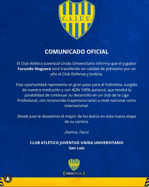 Facundo Noguera, defensor surgido de las inferiores de Juventud Unida Universitario, fue cedido a préstamo por un año a Defensa y Justicia, equipo que compite en la Liga Profesional.