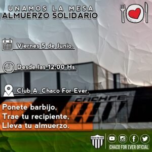 ➡️ Este viernes 5 de junio, a las 12:00 HS, en Club A. Chaco For Ever vamos a ofrecer un almuerzo solidario para todos aquellos que lo necesiten
