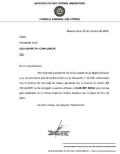 El Torneo Regional Federal Amateur empieza a tomar forma. En las últimas horas el Consejo Federal confirmó dos nuevas licencias a clubes que tendrán permiso para disputar el certamen por 3 años. Uno de los notificados fue Deportivo Roca: