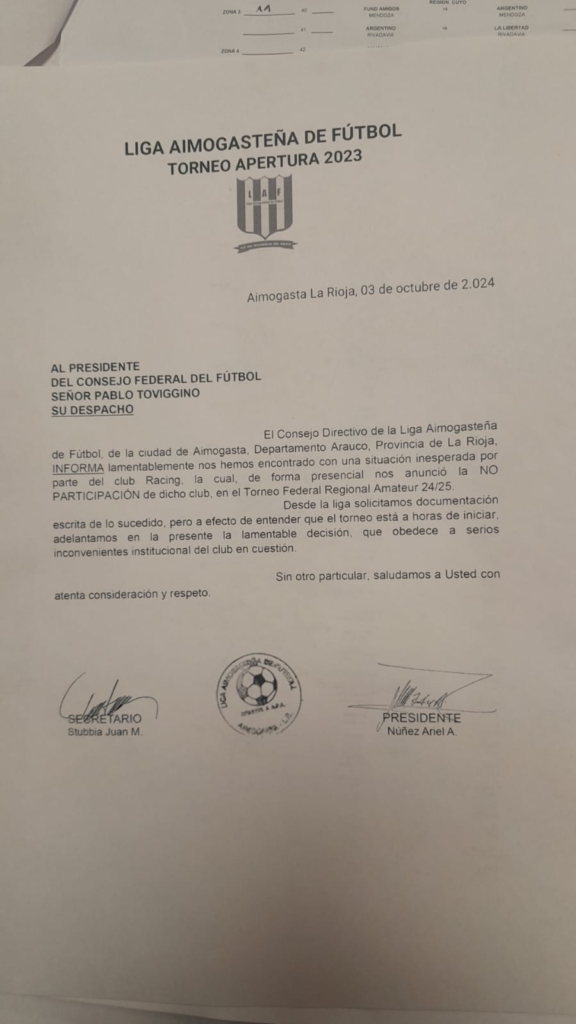 A través de un comunicado oficial, la directiva al frente de Racing Aimogasta confirmó su baja del torneo Regional Amateur, por cuestiones institucionales.